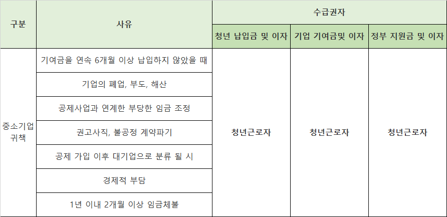 하지만 반대로 중도해지하는 귀책사유가 청년에게 있을 시에는 청년이 납부한 금액과 정부지원금을 지급 받을 수 있지만, 기업이 적립한 금액은 기업이 다시 회수하게 됩니다.