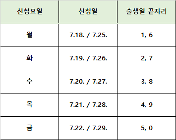 5부제 신청은 출생일 끝자리를 기준으로 신청하며 자신의 신청일에 신청 하지 못한 경우는 8월 1일 ~ 8월 5일. 5일간 추가 신청이 가능합니다. 또한 신청은 해당일 00시부터 23시까지 가능하며 반드시 청년 본인이 신청해야 합니다.