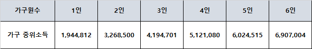 그러니깐 1인가구 기준 중위소득 100%라면 한달 급여 1,944,812원이 기준이 되는 것입니다.