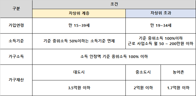 연령, 소득기준, 가구소득, 가구재산 4가지 조건을 충족하는 청년을 대상으로 지원이 이뤄지며, 차상위 계층과 차상위 초과 계층 두 유형으로 나눠 다른 혜택을 지원해주고 있습니다. 그렇다면 자세한 가입 조건은 어떻게 되는지 알아보겠습니다.