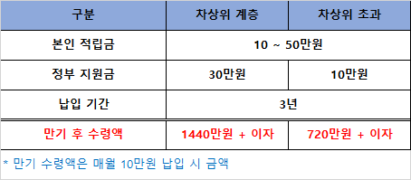 기간은 3년으로 정해져 있어 3년간 매월 꾸준히 적립을 해야 만기금을 받을 수 있으며 중도 해지시 지원금 혜택을 받지 못하게 됩니다.