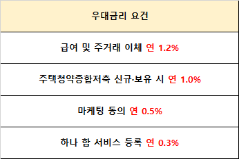 청년내일저축계좌의 경우 하나은행을 통해 개설할 수 있기 때문에 하나은행에서 제시하는 우대금리 요건을 보셔야합니다. 하나은행 계좌를 통해 급여 및 주거래 이체, 주택청약종합저축 신규 또는 보유, 마케팅 동의, 하나 합(하나은행 마이데이터) 서비스 등록을 해야 3.0%의 우대 금리 혜택을 받을 수 있습니다.